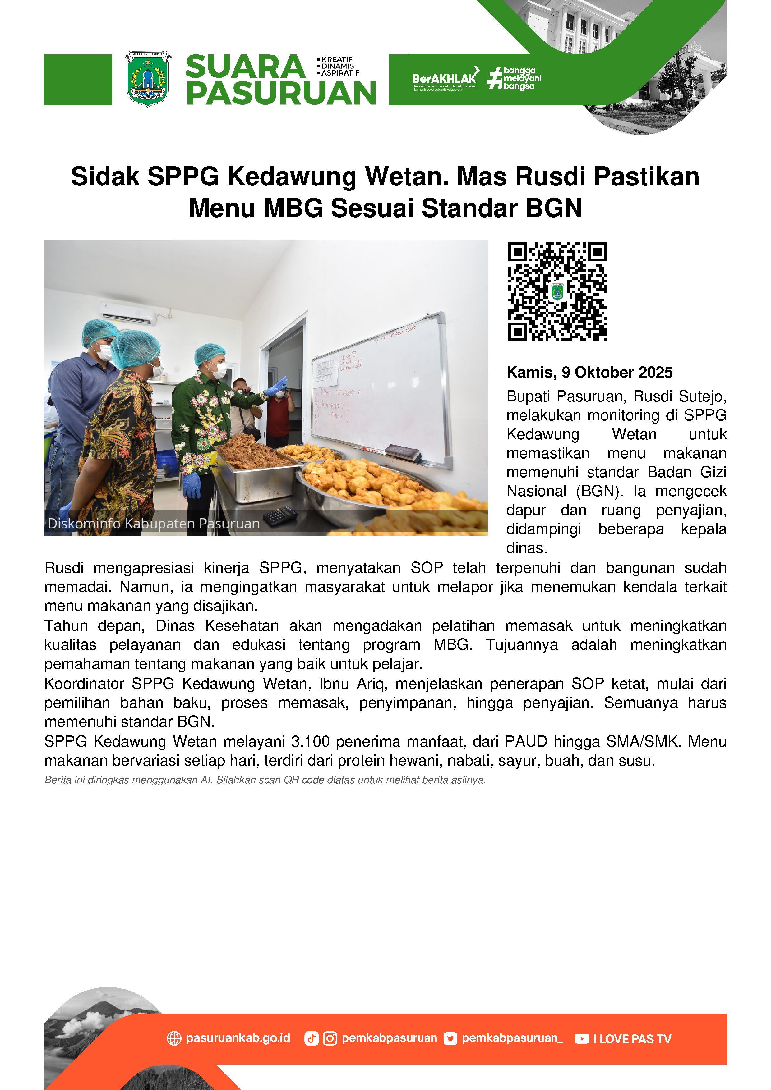 Pantauan di lapangan, Mas Rusdi - sapaan akrab Bupati Pasuruan ini didampingi sejumlah Kepala OPD diantaranya Kepala Bappelitbangda, Kepala Dinas Peternakan dan Kesehatan Hewan, Kadiskominfo, Kadis LH dan lainnya melakukan monitoring ke SPPG Kedawung Wetan, Kecamatan Grati.