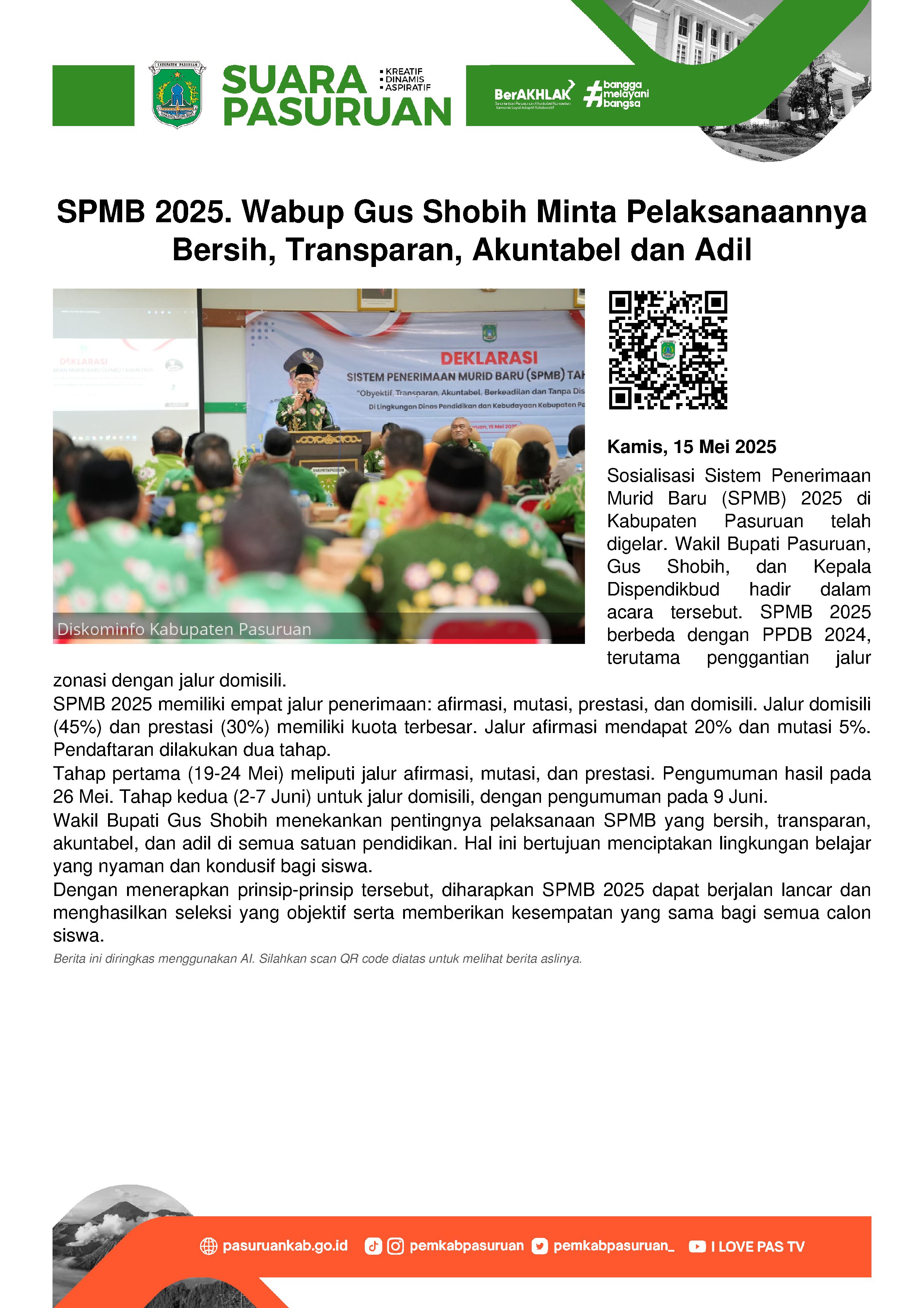 Sementara itu, Wakil Bupati Pasuruan, Shobih Asrori menegaskan bahwa Pemerintah Daerah akan melaksanakan penuh aturan dan kebijakan Pemerintah Pusat tentang SPMB.