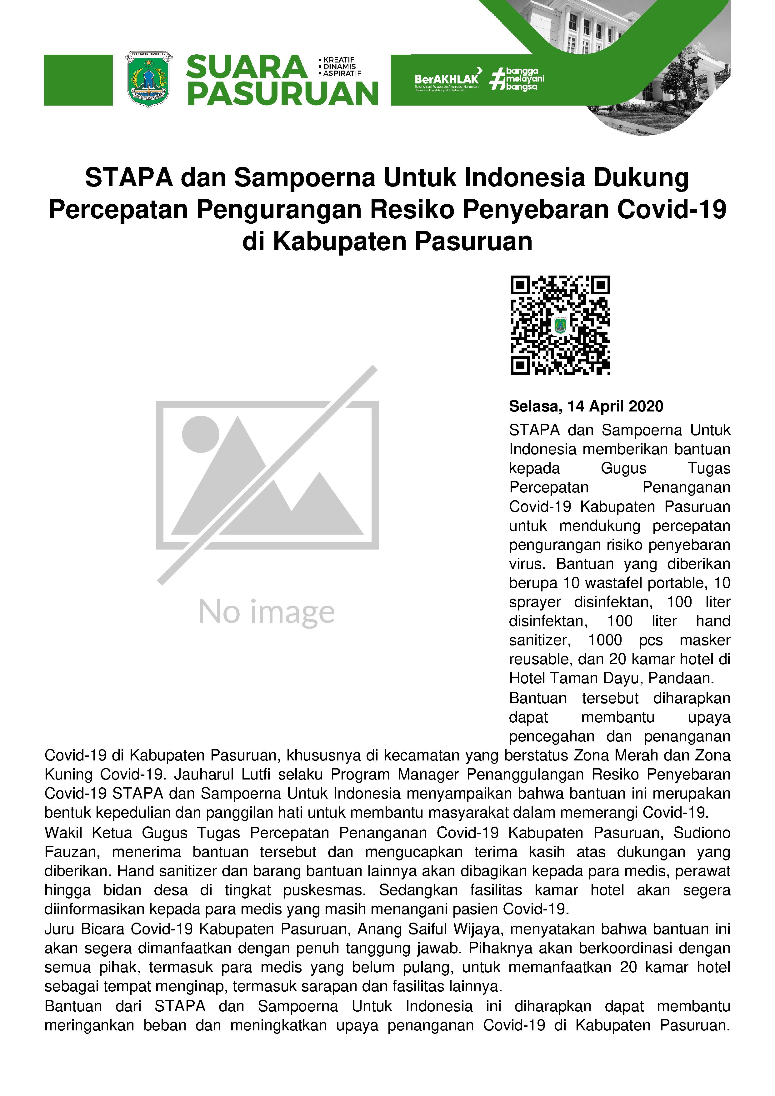 Terhadap bantuan dari STAPA dan Sampoerna untuk Indonesia tersebut, Anang Saiful Wijaya selaku Juru Bicara Covid-19 Kabupaten Pasuruan mengucapkan terima kasih yang setinggi-tingginya. Untuk selanjutnya, bantuan tersebut akan segera dimanfaatkan dengan penuh tanggung jawab. Untuk hand sanitizer hingga bantuan barang akan dibagikan untuk para medis, perawat hingga bidan desa di tingkat puskesmas. Sedangkan bantuan fasilitas kamar hotel akan segera diinformasikan kepada para medis yang hingga kini masih disibukkan dengan para pasien covid-19.