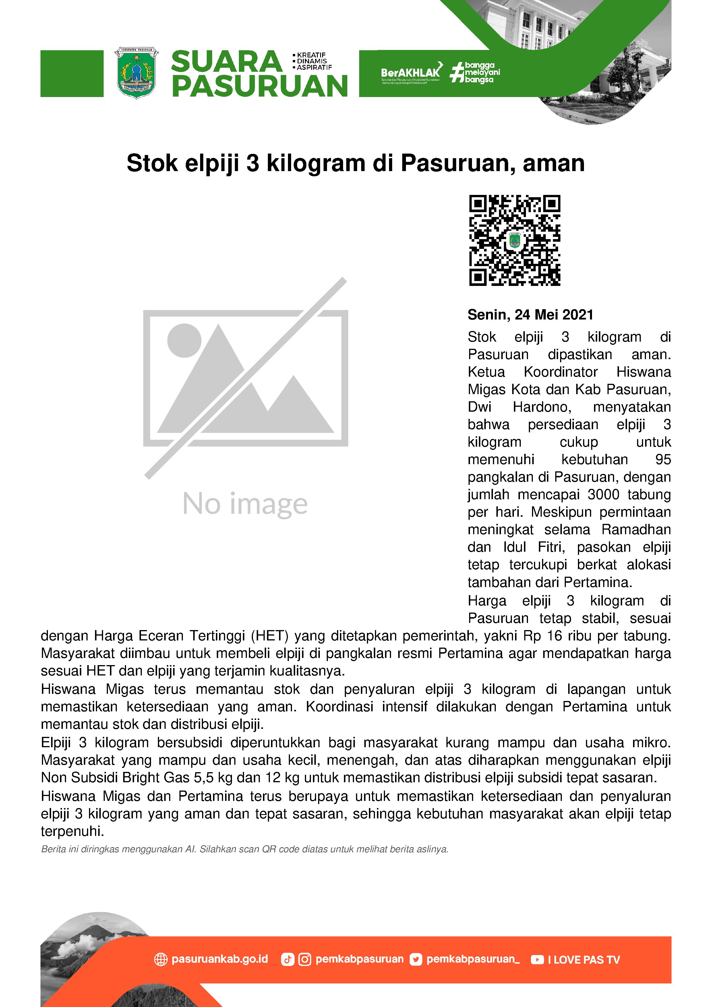 Dwi Hardono selaku Ketua Koordinator Hiswana Migas Kota dan Kab Pasuruan mengatakan, persediaan elpiji 3 kilogram masih mencukupi untuk 95 pangkalan yang ada di Kota maupun Kabupaten Pasuruan.