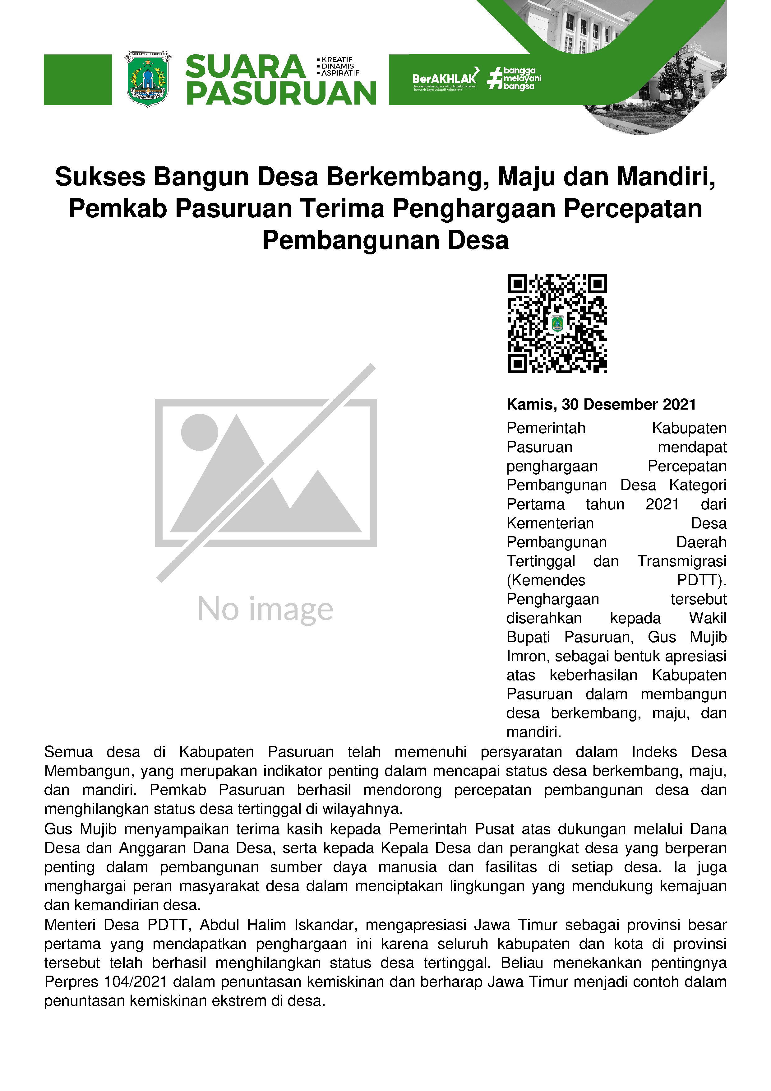 Pemerintah Kabupaten Pasuruan mendapatkan Penghargaan Percepatan Pembangunan Desa Kategori Pertama tahun 2021 dari Kementerian Desa Pembangunan Daerah Tertinggal dan Transmigrasi (Kemendes PDTT).