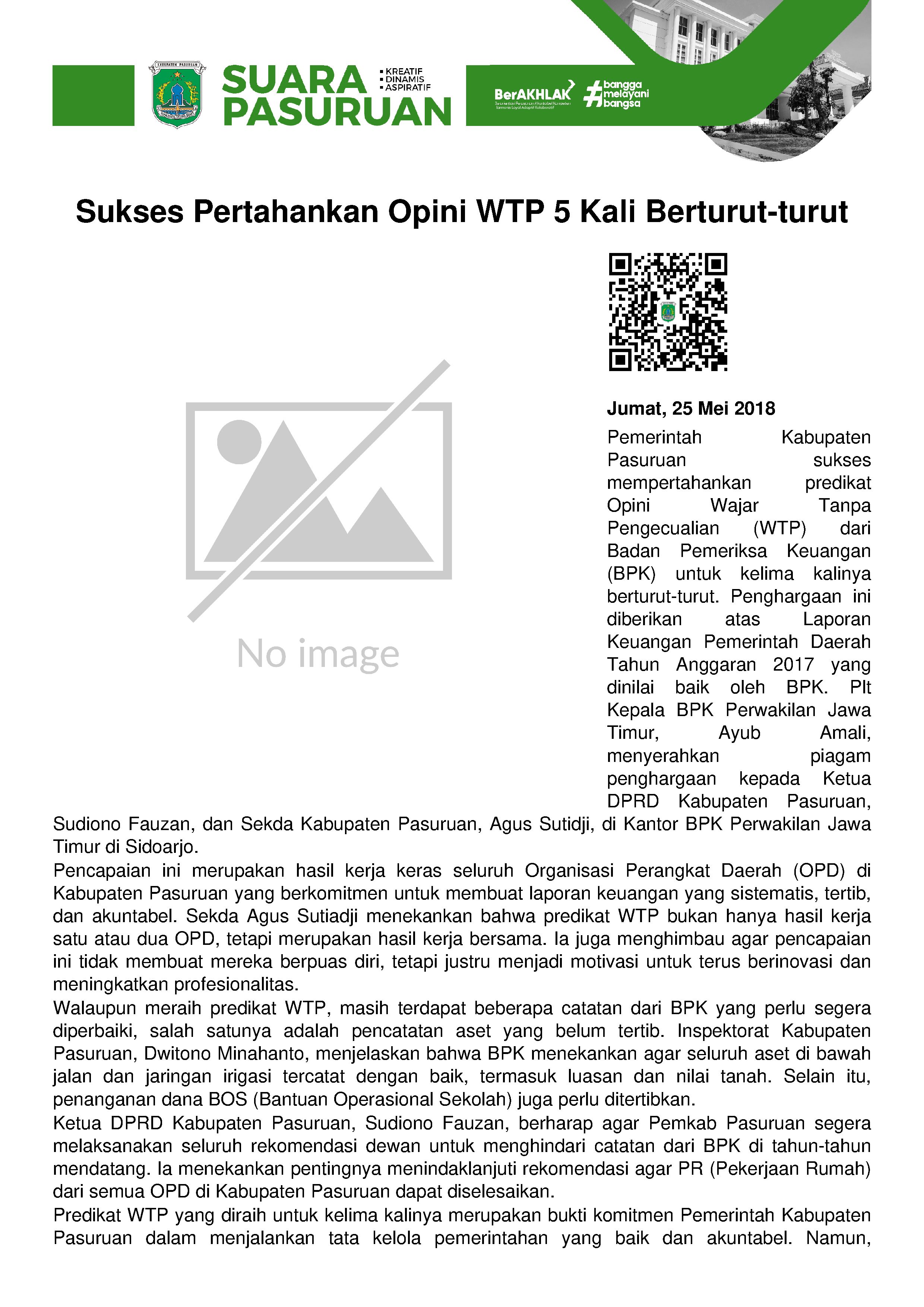 Lima tahun berturut-turut, Pemerintah Kabupaten Pasuruan meraih predikat Opini Wajar Tanpa Pengecualian (WTP) dari Badan Pemeriksa Keuangan (BPK).