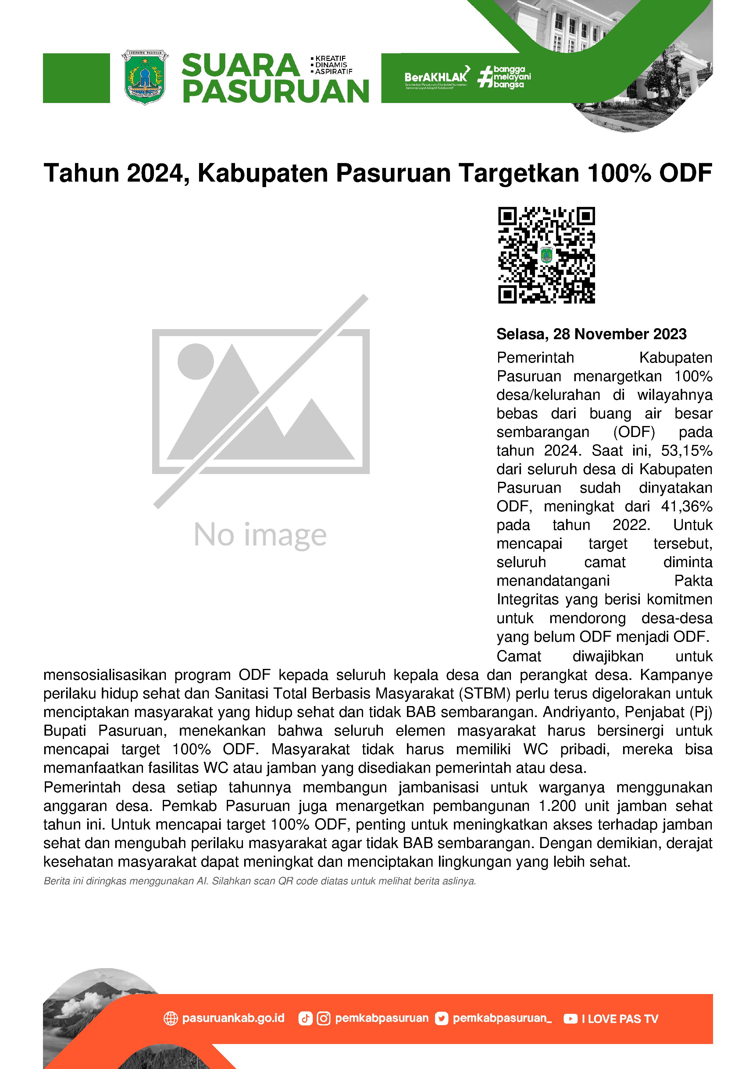 Tahun 2024 mendatang, Pemerintah Kabupaten Pasuruan menargetkan 100% Open Defecation Free (ODF) di seluruh desa/kelurahan.