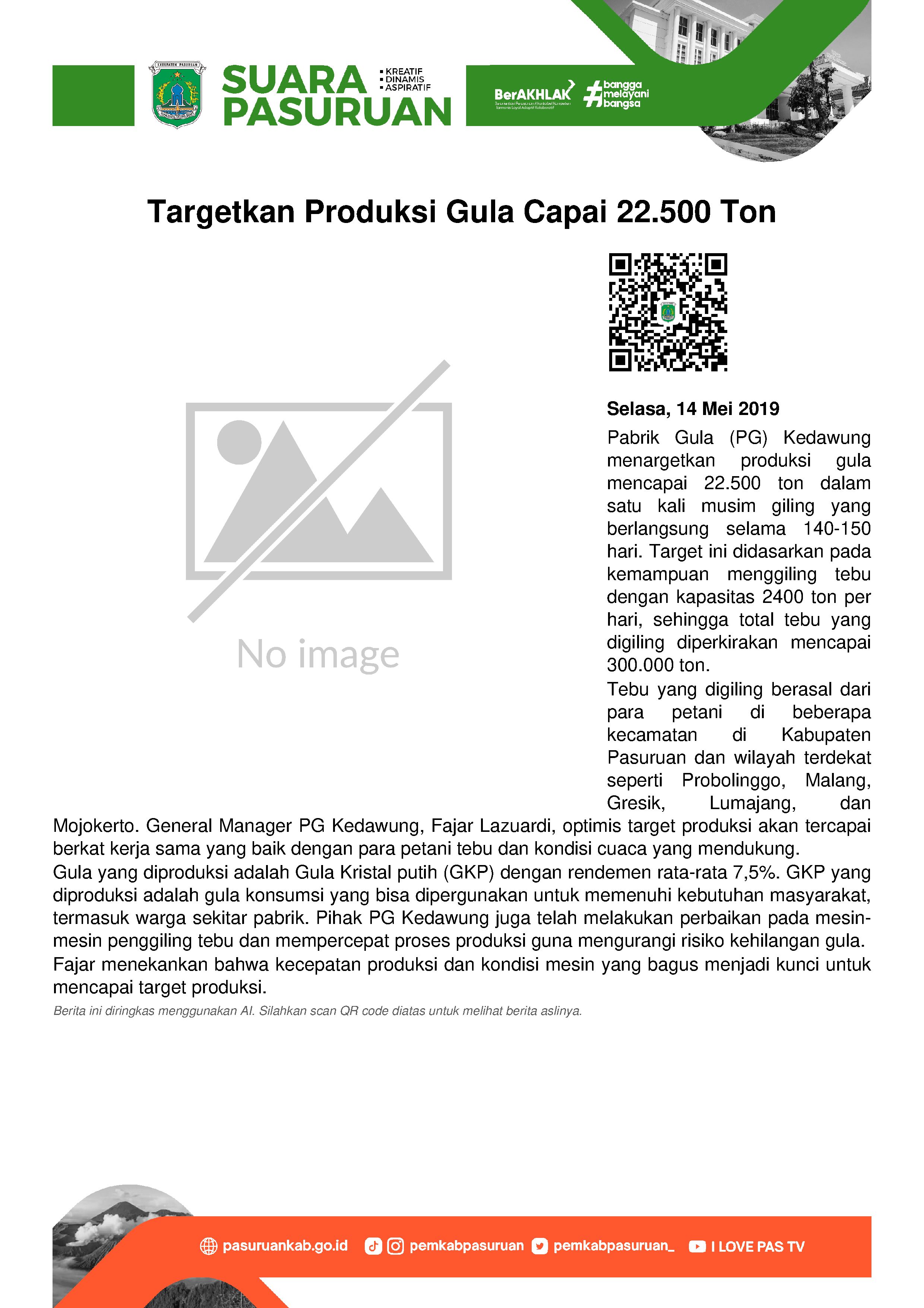 “Yang paling mendukung tercapainya target produksi gula kami ya tebu itu sendiri. Alhamdulillah kerja sama dengan para petani tebu sangat baik, sehingga Insya Allah target kita akan tercapai sesuai waktunya,” kata Fajar saat ditemui di kantornya, Selasa (14/05/2019).