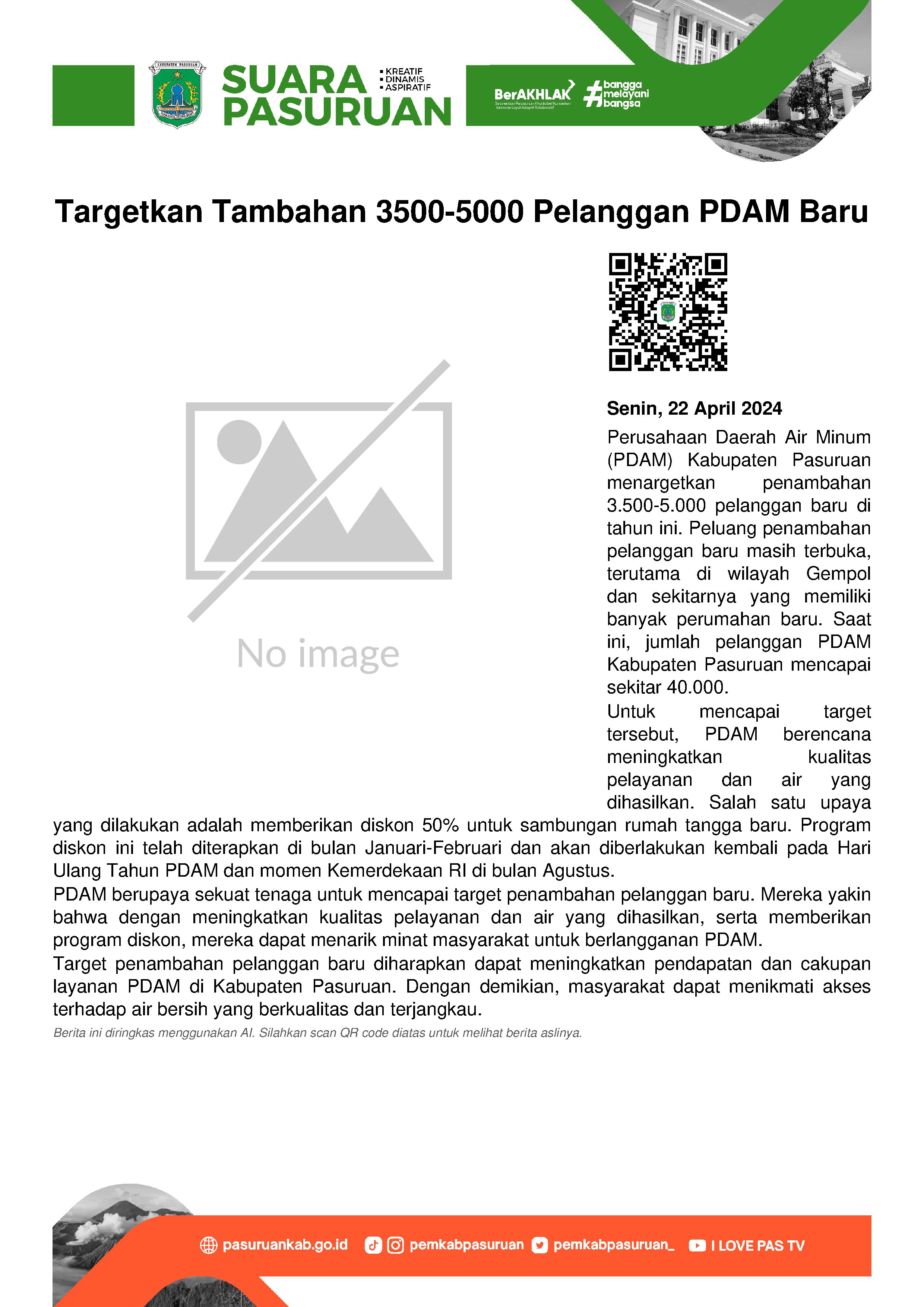 Menurutnya, peluang penambahan pelanggan baru masih terbuka. Sebab, selain wilayah Kabupaten Pasuruan yang luas, juga dipengaruhi banyaknya rumah yang membutuhkan sambungan PDAM.