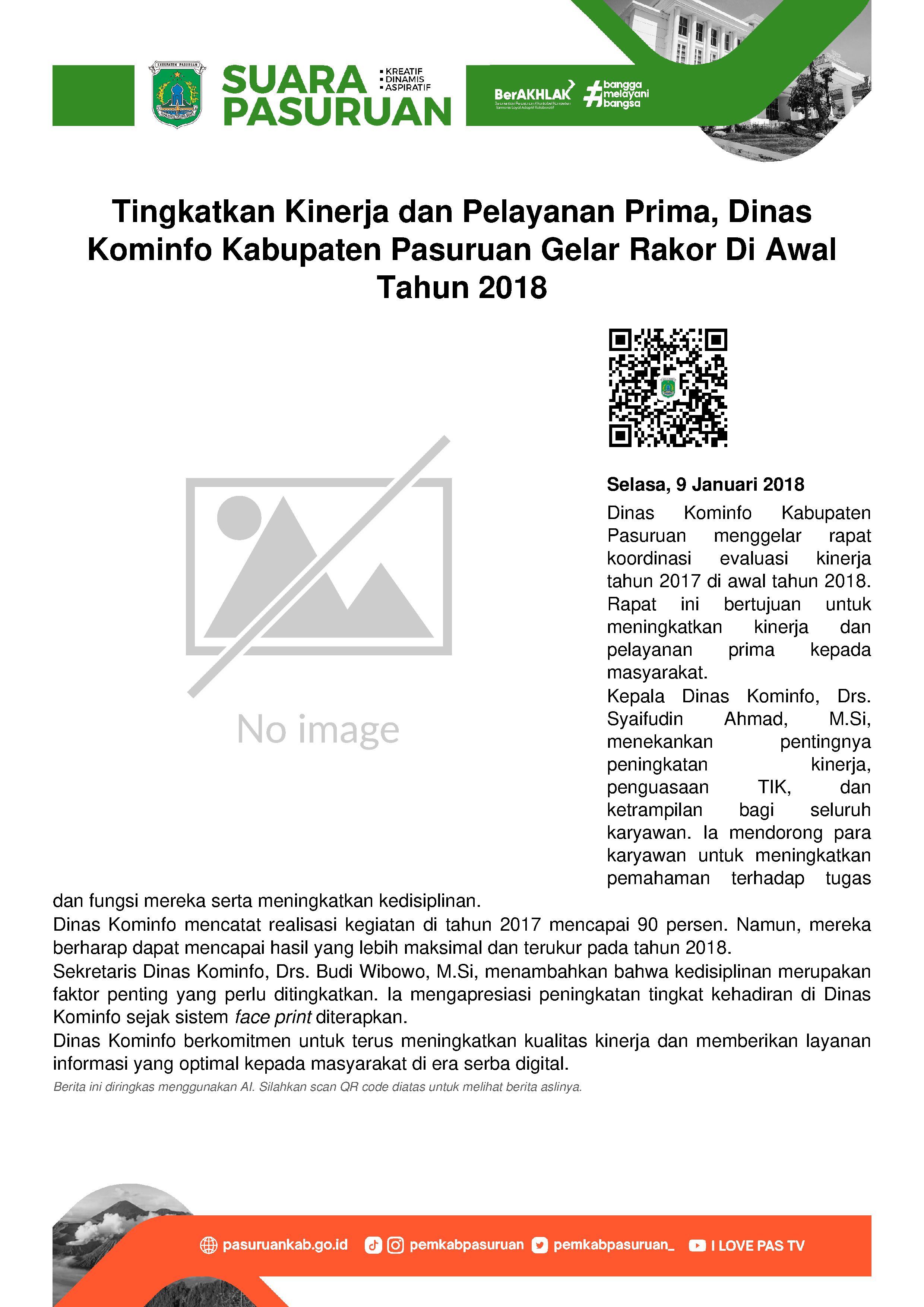 “Saya berharap, di awal tahun 2018, kita semua bisa terus berpacu meningkatkan kualitas kinerja untuk memberikan layanan informasi kepada masyarakat lebih optimal. Jadi sudah menjadi keharusan bagi kita memiliki keahlian dan penguasaan TIK, disesuaikan dengan Tusi masing-masing. Tak tak kalah penting, kedisiplinan juga harus terus ditingkatkan”, tandasnya.