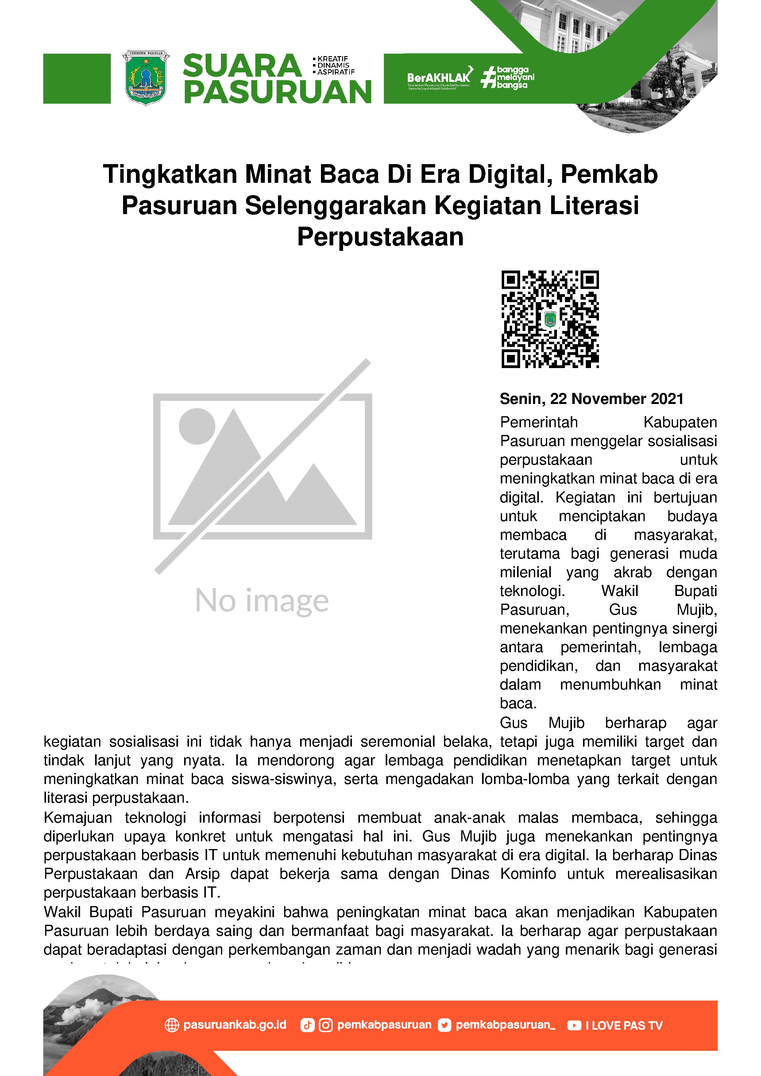 Terakhir, Wakil Bupati kembali menggarisbawahi pernyataannya bahwa dengan literasi membaca, maka diharapkan akan menjadikan Kabupaten Pasuruan lebih berdaya saing dan maslahat. Untuk mewujudkannya, perwajahan perpustakaan secara otomatis juga aptif terhadap perkembangan jaman.