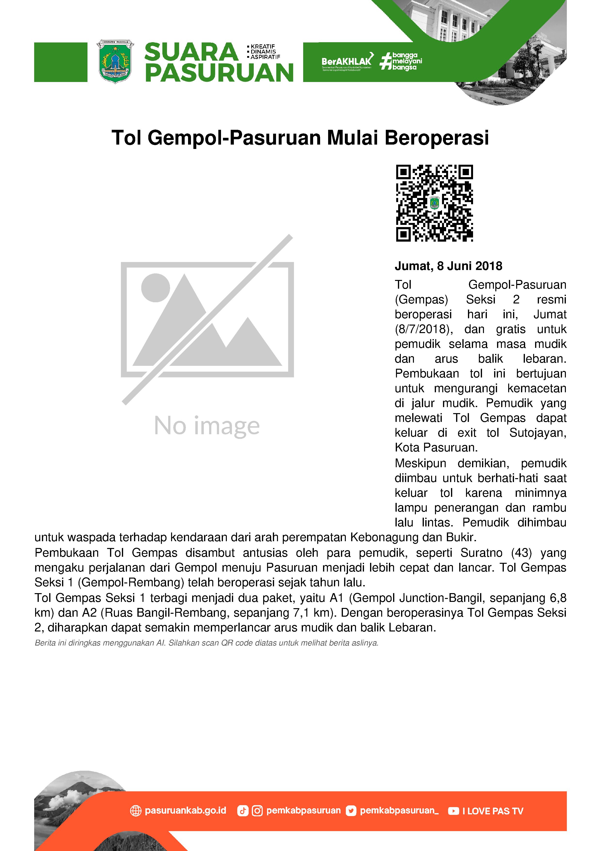 Mulai hari ini, Jumat (08/07/2018), Tol Rembang-Pasuruan (Gempas) mulai beroperasi dan bisa dilewati oleh para pemudik maupun pengendara roda empat lainnya.
