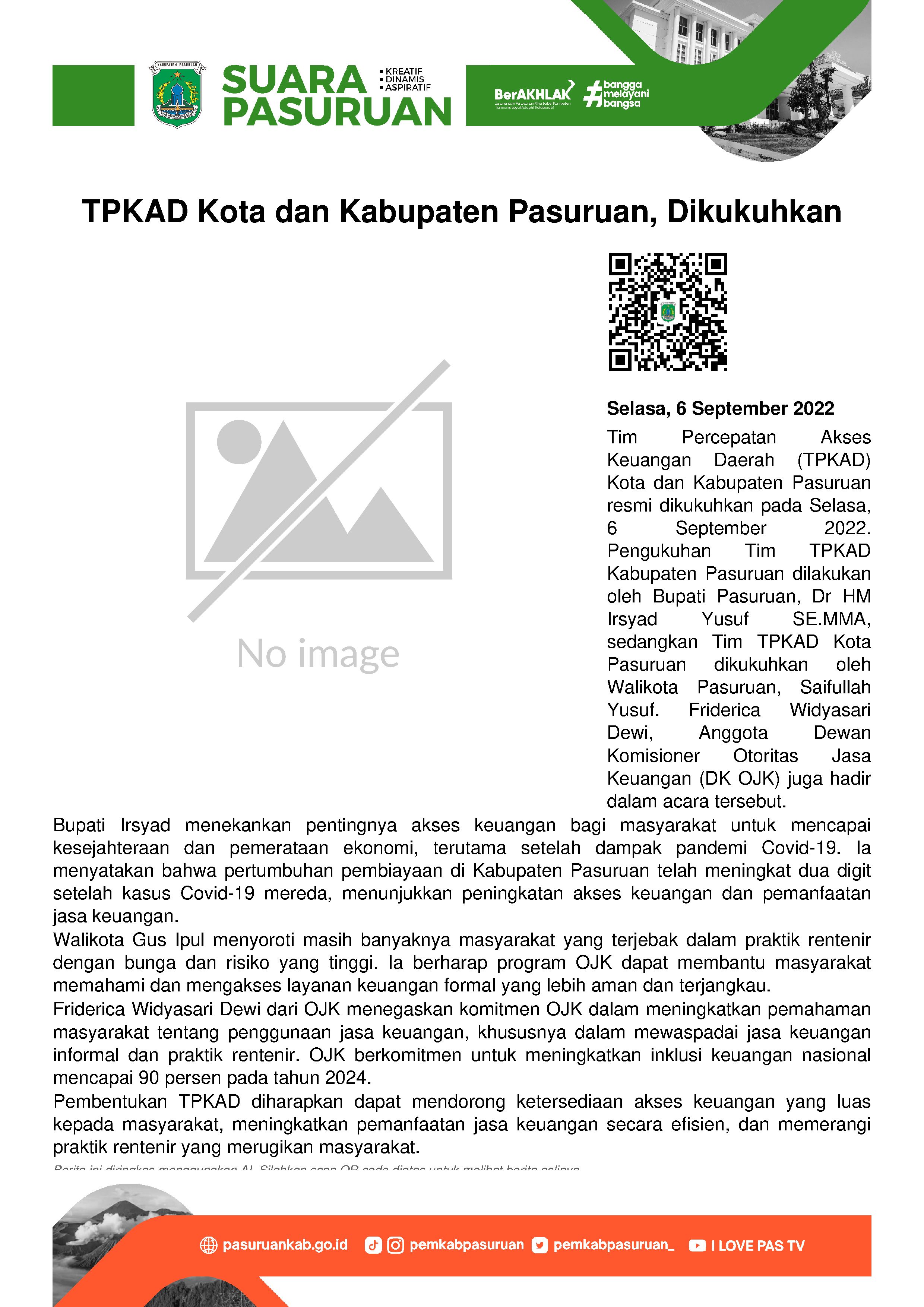 "TPKAD hadir untuk memastikan wilayah Kabupaten Pasuruan mendapatkan akses layanan keuangan formal. Kalau akses keuangan meningkat, maka pemanfaatan jasa keuangan juga menjadi lebih cepat dan efisien," harapnya.