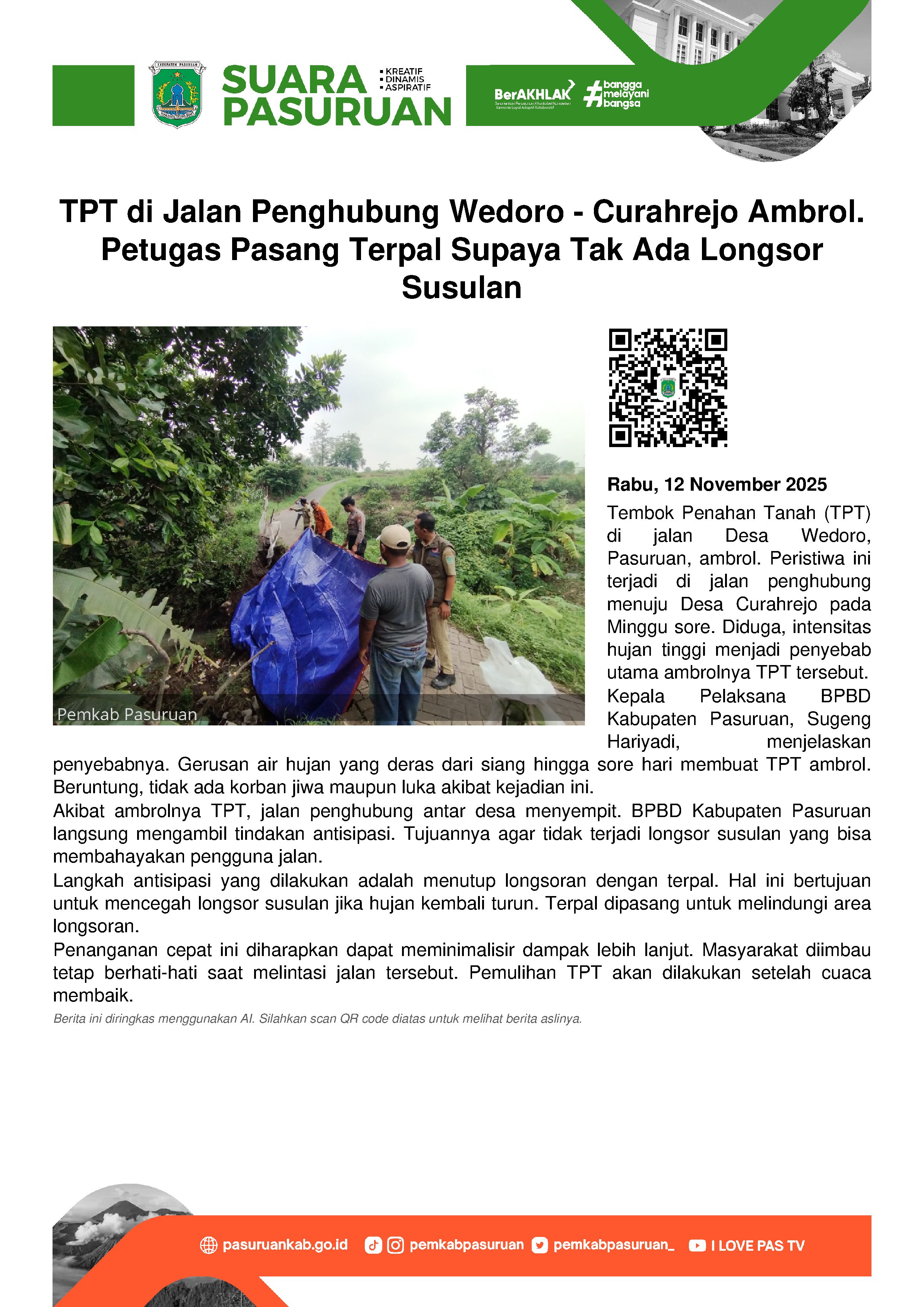 Akibat ambrolnya TPT itu, jalan penghubung antar desa mengalami penyempitan. Kata Sugeng, pasca kejadian pihaknya langsung melakukan berbagai langkah antisipasi. Yakni menutupi longsoran dengan terpal agar tak sampai terjadi longsor susulan.