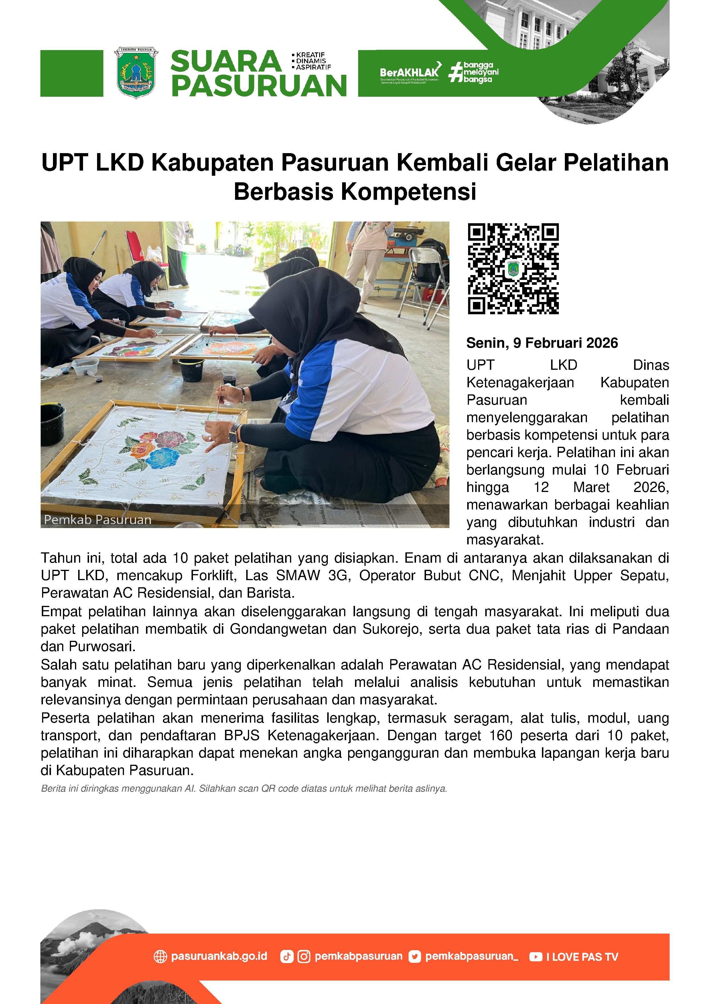 "Kalau yang membatik akan dilaksanakaan saat kegiatan TMMD di Gondangwetan dan di Desa Candibinangun, Kecamatan Sukorejo. Kalau tata rias di Pandaan dan Purwosari," kata Farid saat ditemui di Dinas Ketenagakerjaan Kabupaten Pasuruan, Senin (9/2/2026).