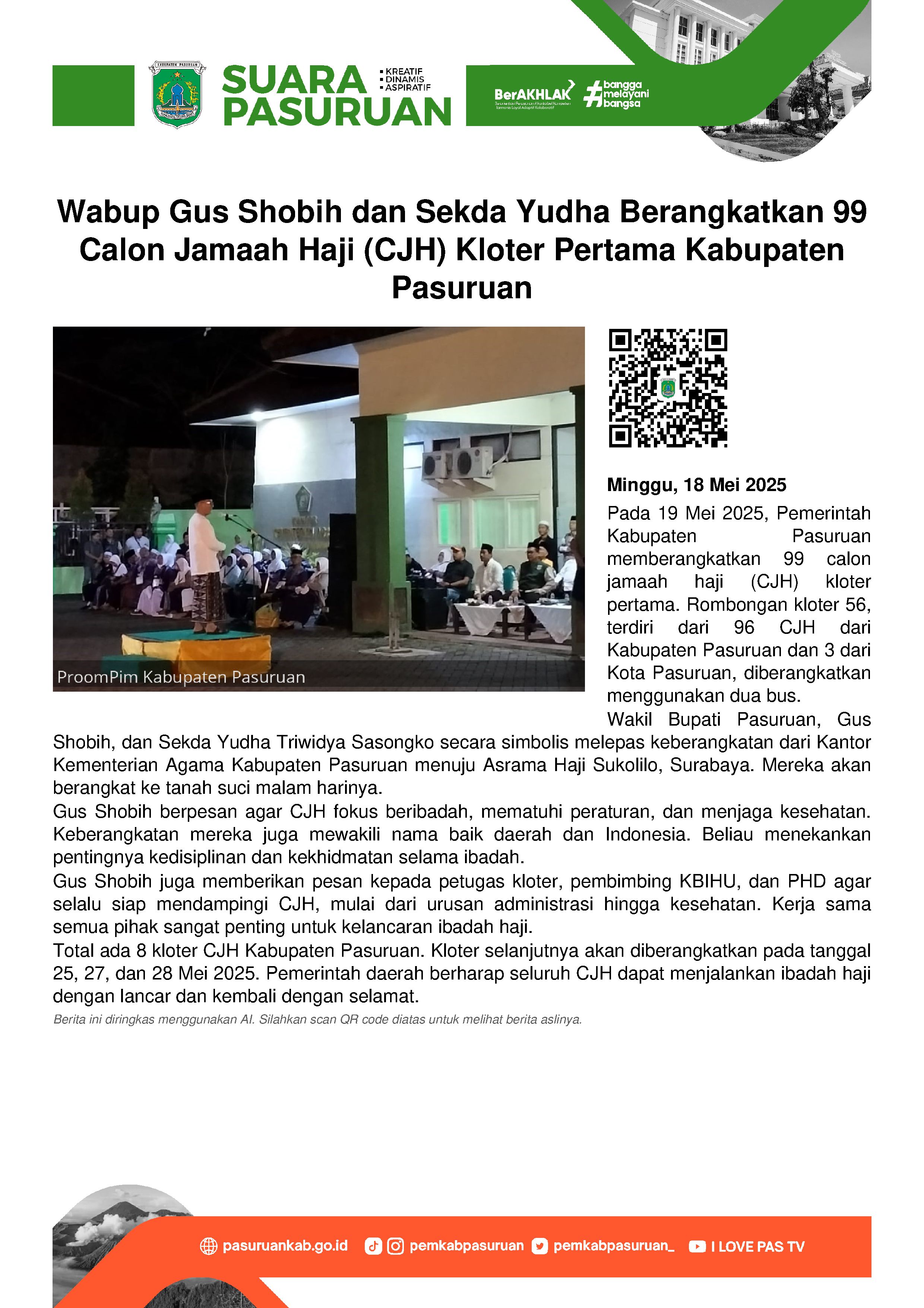 Hari ini, Minggu (19/5/2025), Pemerintah Kabupaten Pasuruan memberangkatkan Calon Jamaah Haji (CJH) Kabupaten Pasuruan Tahun 1446 Hijriyah/2025 Masehi. Adapun rombongan yang diberangkatkan dengan menggunakan 2 bus, kloter 56, merupakan kloter perdana Kabupaten Pasuruan.