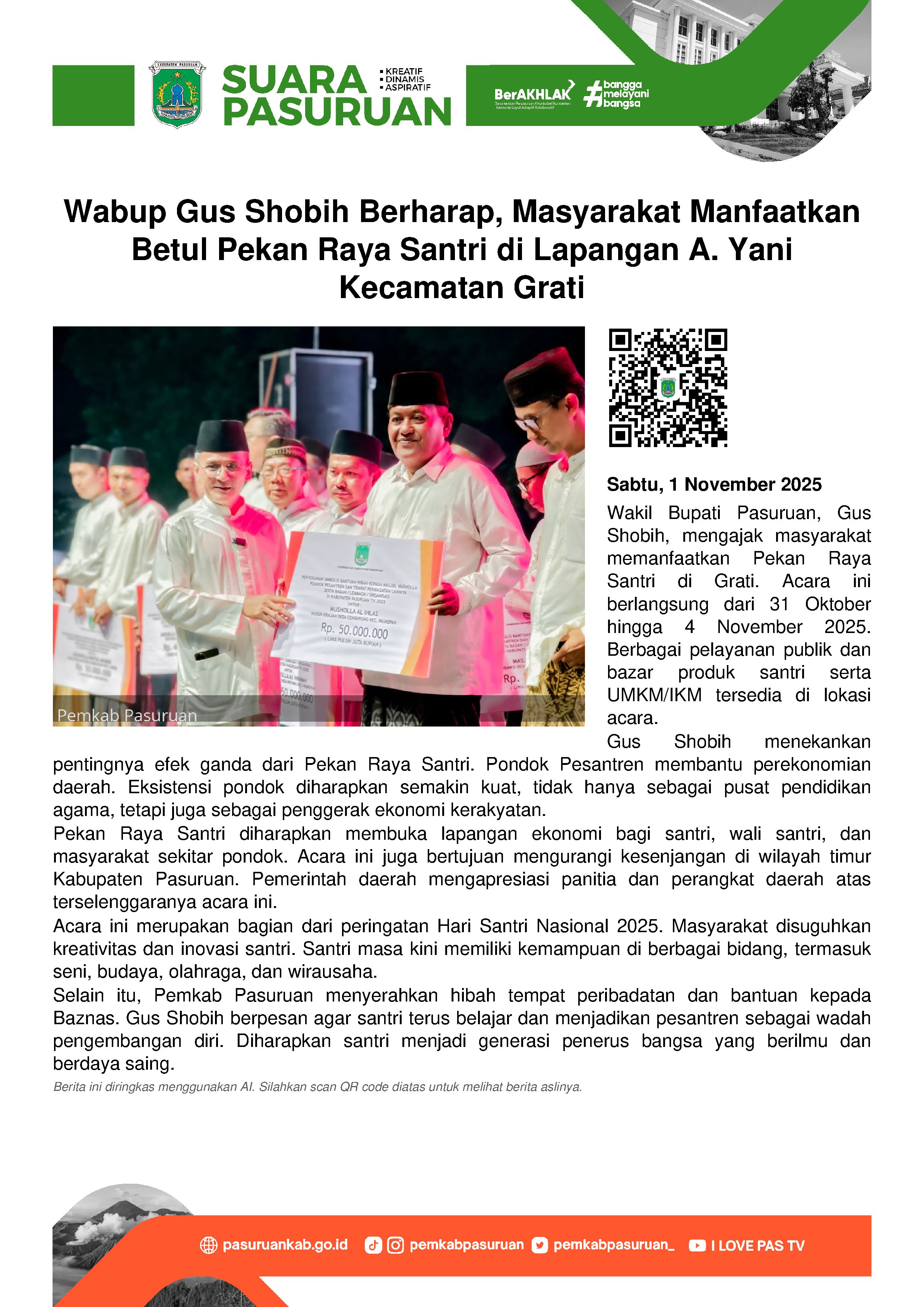 Wakil Bupati Pasuruan, Shobih Asrori mengajak seluruh masyarakat agar memanfaatkan betul Pekan Raya Santri yang digelar di Lapangan A. Yani, Desa Gratitunon, Kecamatan Grati. Himbauan itu disampaikannya pada saat membuka agenda yang digelar mulai tanggal 31 Oktober hingga 4 November 2025 tersebut.