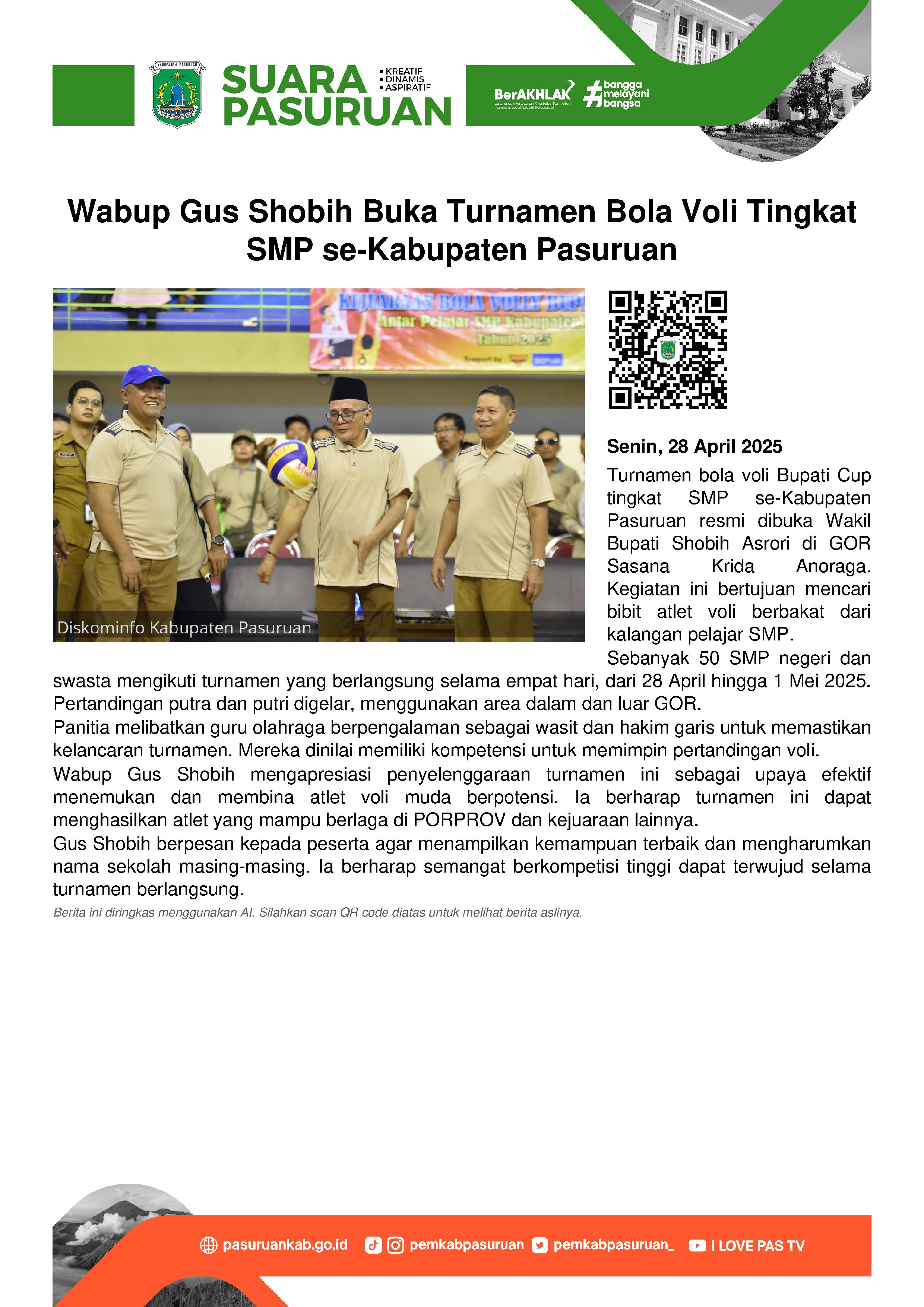 Untuk mencari bibit baru berkualitas, Dinas Pendidikan dan Kebudayaan (Dispendikbud) Kabupaten Pasuruan bersama Musyawarah Guru Mata Pelajaran (MGMP) Guru Pendidikan Jasmani, Olahraga dan Kesehatan (PJOK) SMP Negeri/Swasta menggelar Turnamen Bola Voli Bupati Cup tingkat SMP.