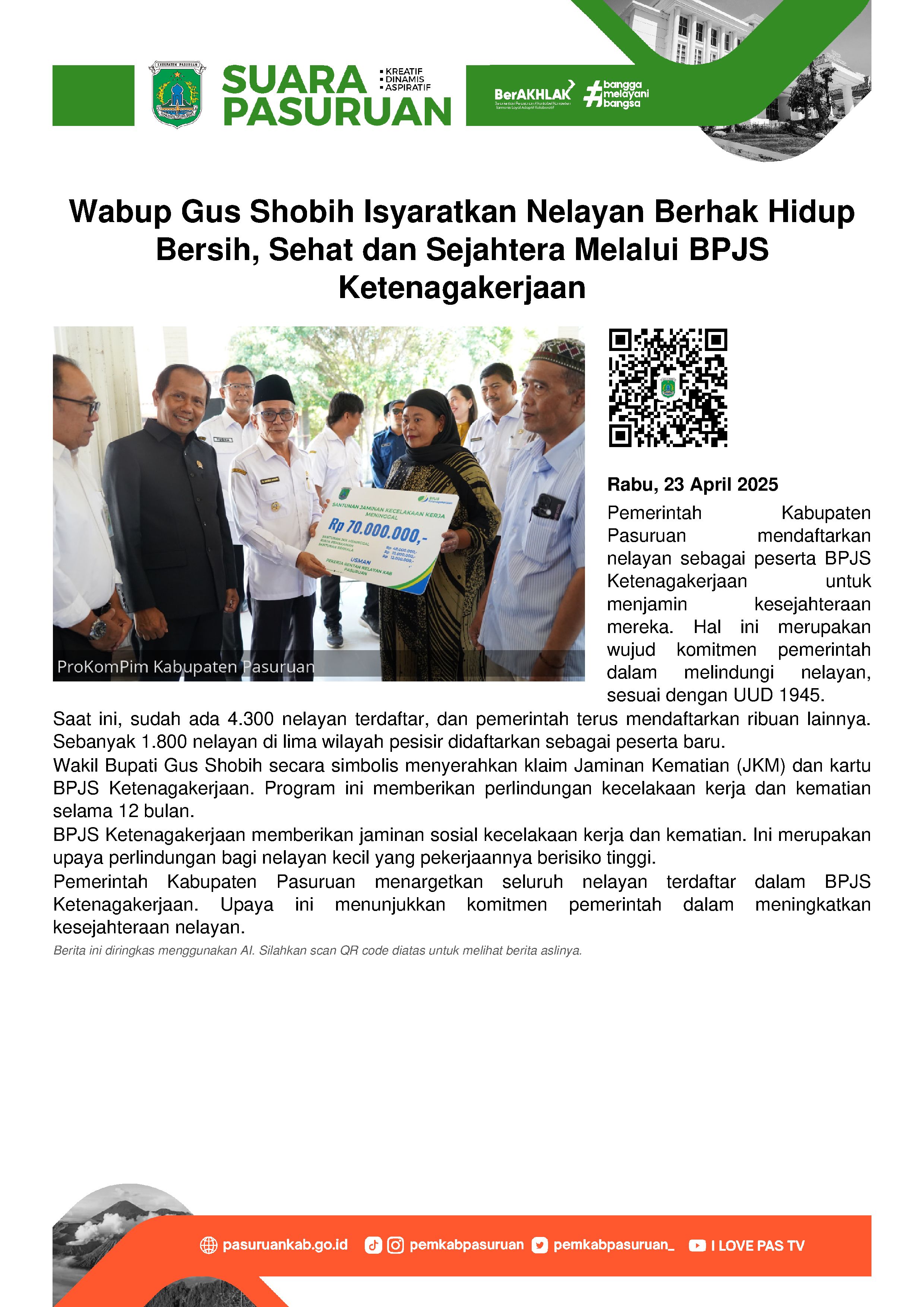 Sementara itu, Kepala Dinas Perikanan Kabupaten Pasuruan, Alfi Khasanah menyebutkan hingga sampai saat ini, Pemerintah Kabupaten Pasuruan telah memberikan bantuan iuran BPJS untuk nelayan sebanyak 4.300 orang dari 8.543 nelayan. Sehingga masih tersisa 4.243 nelayan yang belum tersentuh.