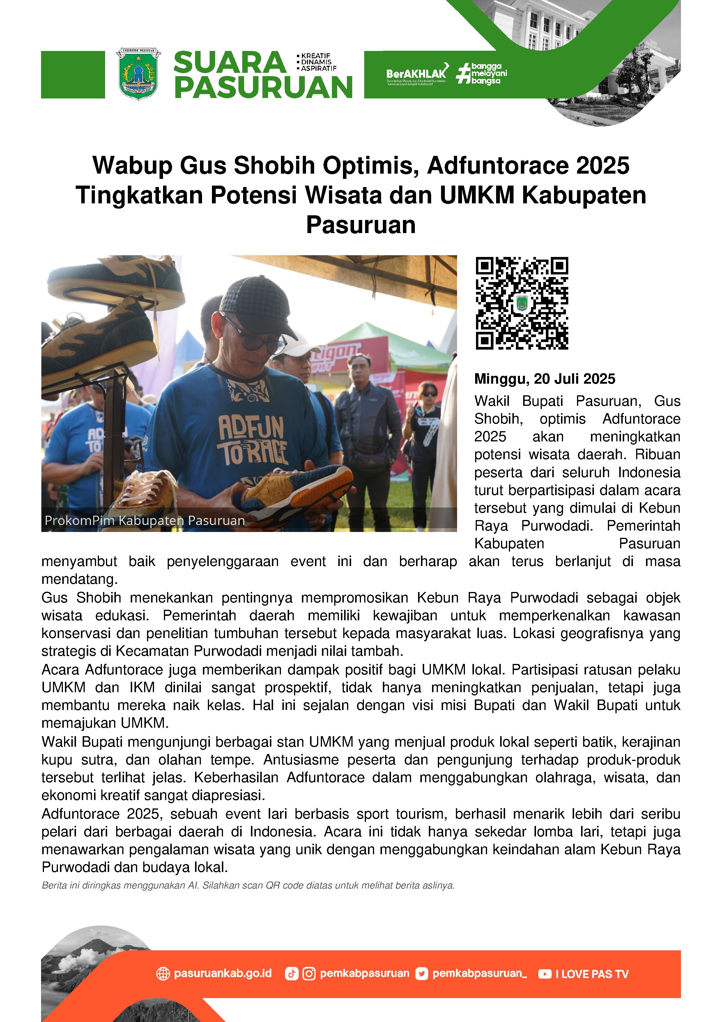 Gus Shobih, demikian biasanya Wakil Bupati Pasuruan akrab disapa optimis, Adfuntorace 2025 yang sukses digelar hari Minggu (20/7/2025), mampu mendongkrak potensi wisata Kabupaten Pasuruan. Pernyataan itu disampaikannya sesaat seusai memberangkatkan ribuan pelari dari titik start di Kebun Raya Purwodadi.