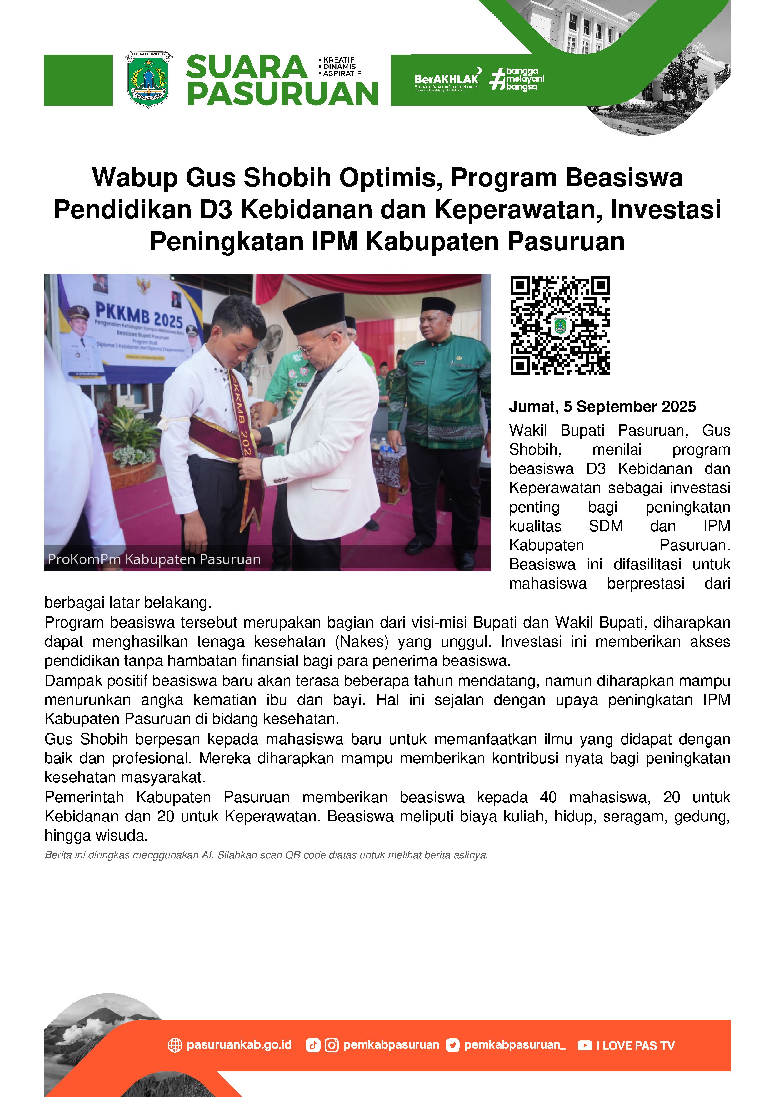 Gus Shobih, demikian biasanya Wakil Bupati Pasuruan disapa mengisyaratkan, pemberian Beasiswa Program Pendidikan D3 Kebidanan dan Keperawatan yang digulirkan oleh Pemerintah Kabupaten Pasuruan merupakan investasi tak ternilai bagi daerah. Menurutnya, fasilitasi akses pendidikan tak berbayar bagi para pembelajar berprestasi tersebut akan berdampak terhadap peningkatan kualitas Sumber Daya Manusia (SDM). Pada akhirnya akan mendorong Indeks Pembangunan Manusia (IPM) Kabupaten Pasuruan.