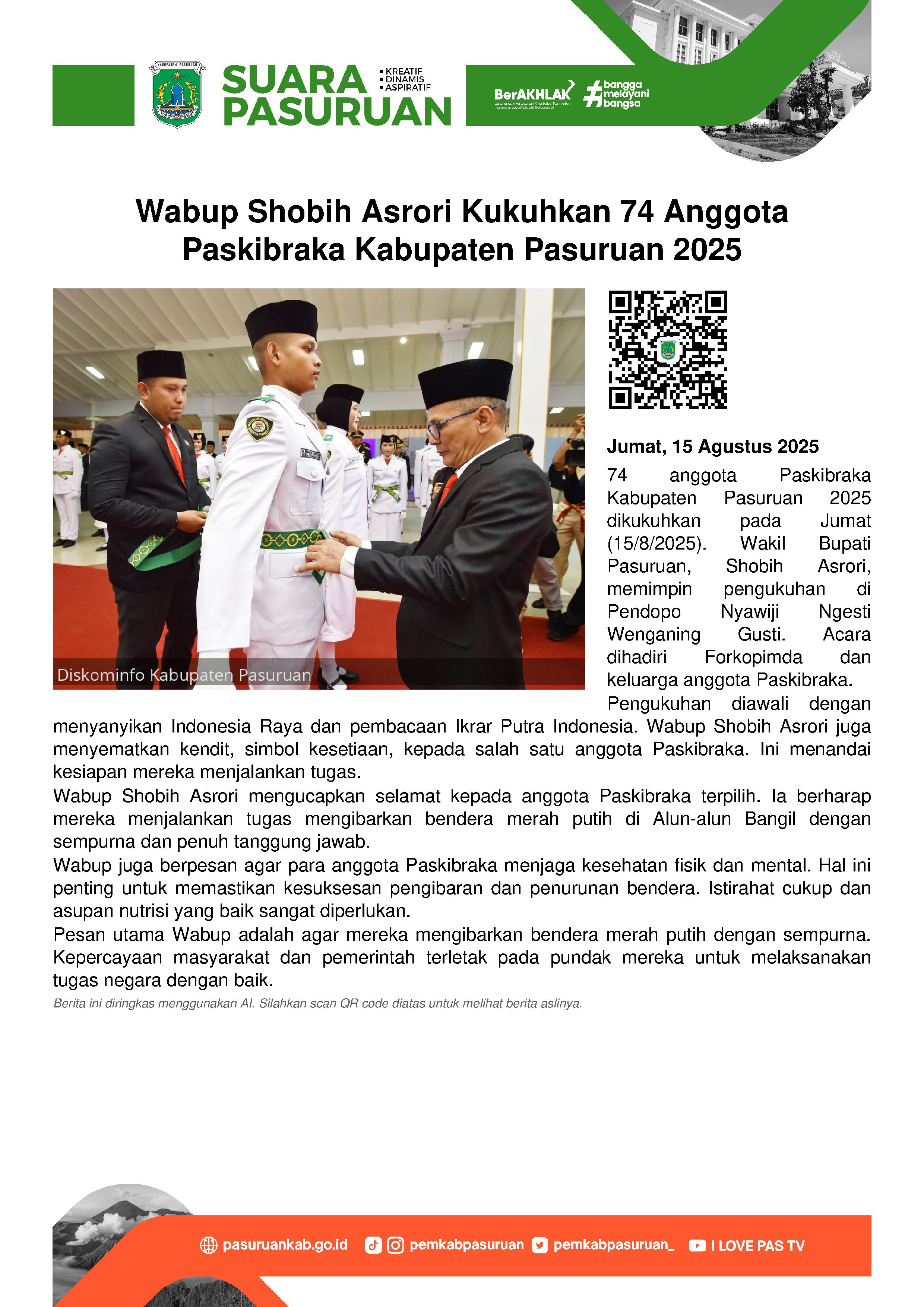 Para pengibar bendera merah putih yang akan bertugas pada tanggal 17 Agustus esok dikukuhkan oleh Wakil Bupati Pasuruan, Shobih Asrori di Pendopo Nyawiji Ngesti Wenganing Gusti. Hadir pula seluruh anggota Forkopimda (Forum Koordinasi Pimpinan Daerah) Kabupaten Pasuruan hingga para keluarga anggota Paskibraka.