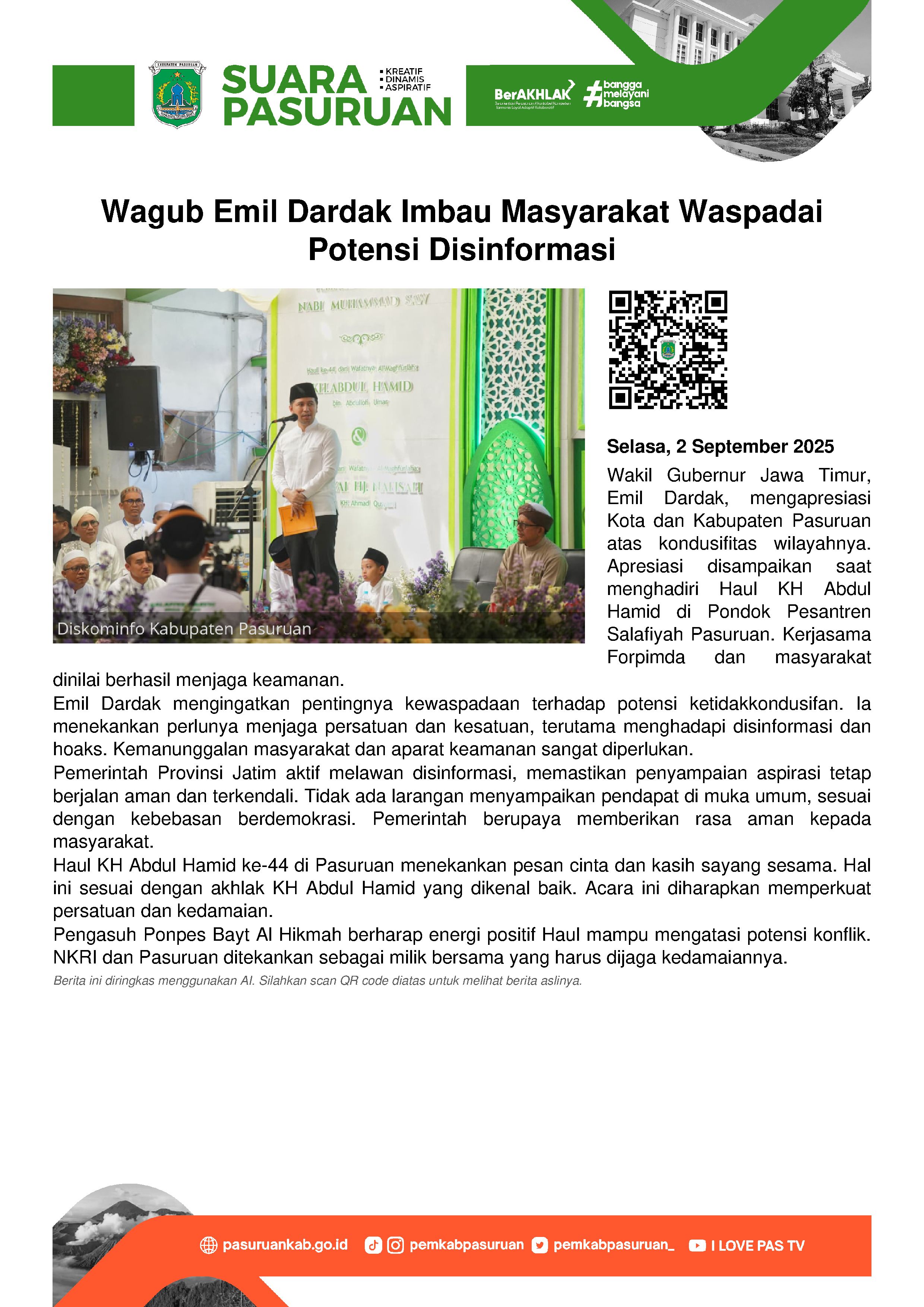 Apresiasi tersebut disampaikan Wakil Gubernur Jawa Timur, Emil Elestianto Dardak saat menghadiri Haul Al Maghfurloh KH Abdul Hamid ke 44 di Pondok Pesantren Salafiyah Pasuruan, Selasa (2/9/2025).