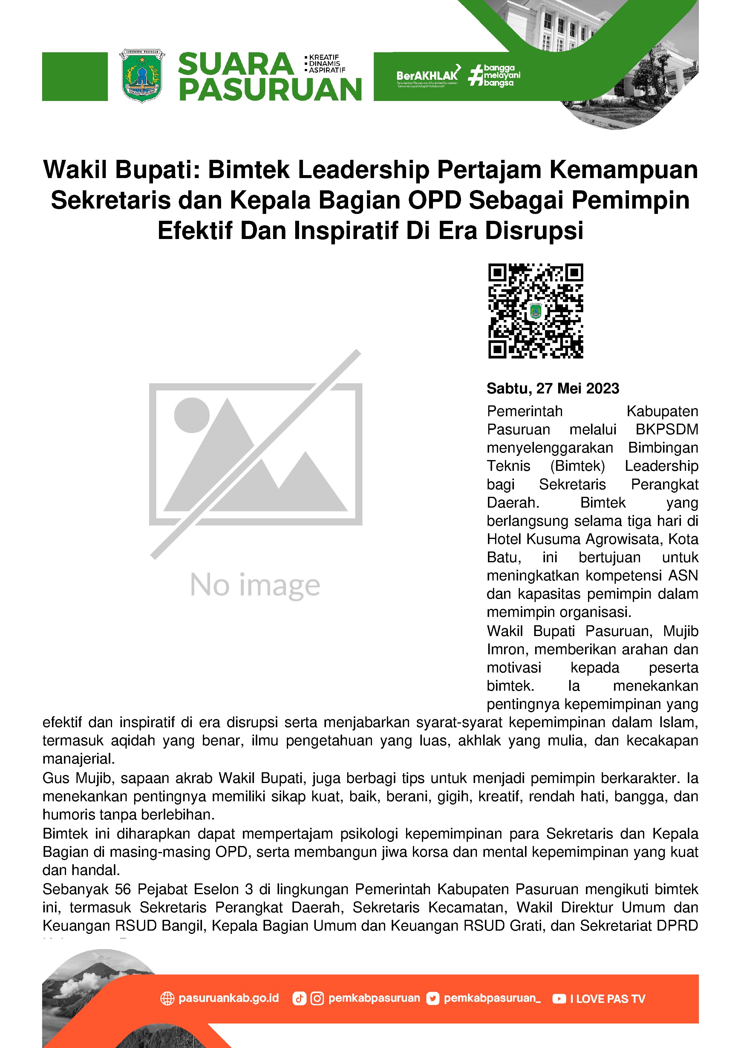 Untuk meningkatkan pengembangan kompetensi Aparatur Sipil Negara (ASN) dan kapasitas Pemimpin dalam memimpin suatu organisasi, Pemerintah Kabupaten Pasuruan melalui Badan Kepegawaian dan Pengembangan Sumber Daya Manusia (BKPSDM) kembali menggelar Bimbingan Teknis (Bimtek) Leadership Bagi Sekretaris Perangkat Daerah Kabupaten Pasuruan. Dalam agenda yang dilaksanakan di Hotel Kusuma Agrowisata, Kota Batu selama tiga hari (25-27 Mei 2023) tersebut dibuka oleh Sekretaris Daerah Kabupaten Pasuruan, Yudha Triwidya Sasongko. Kemudian dilanjutkan dengan penyampaikan materi bertema Kepemimpinan Dalam Islam oleh Wakil Bupati Pasuruan, Mujib Imron.