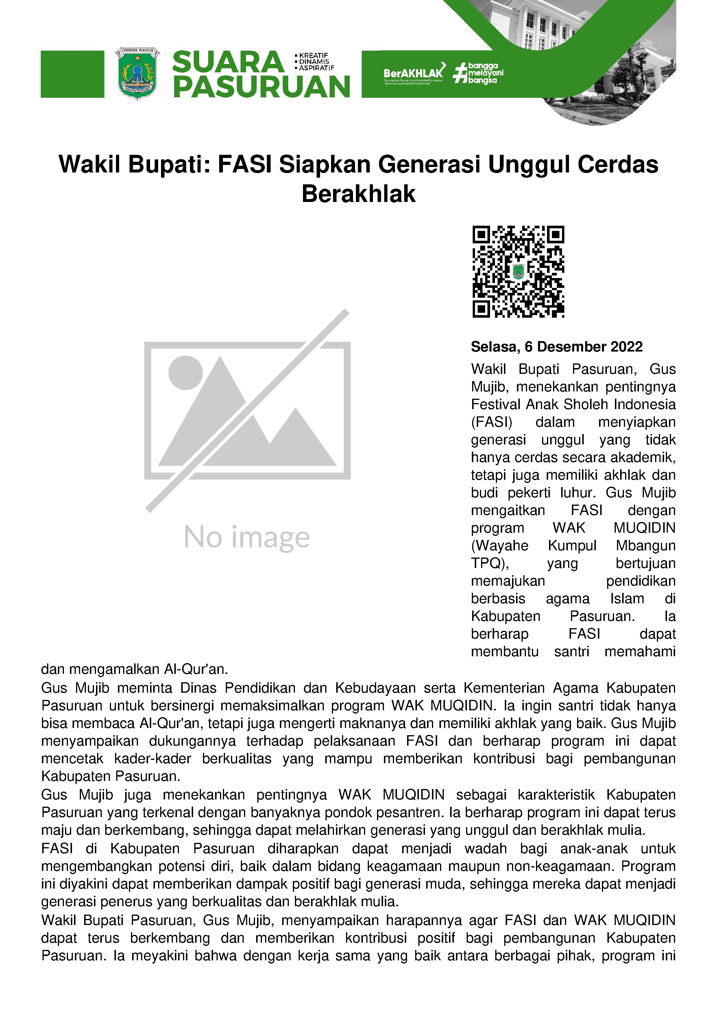 Festival Anak Sholeh Indonesia (FASI) bagian dari upaya Pemerintah Kabupaten Pasuruan untuk menyiapkan generasi unggul. Harapannya, tidak hanya cerdas secara akademik saja, melainkan juga memiliki akhlak dan budi pekerti luhur.