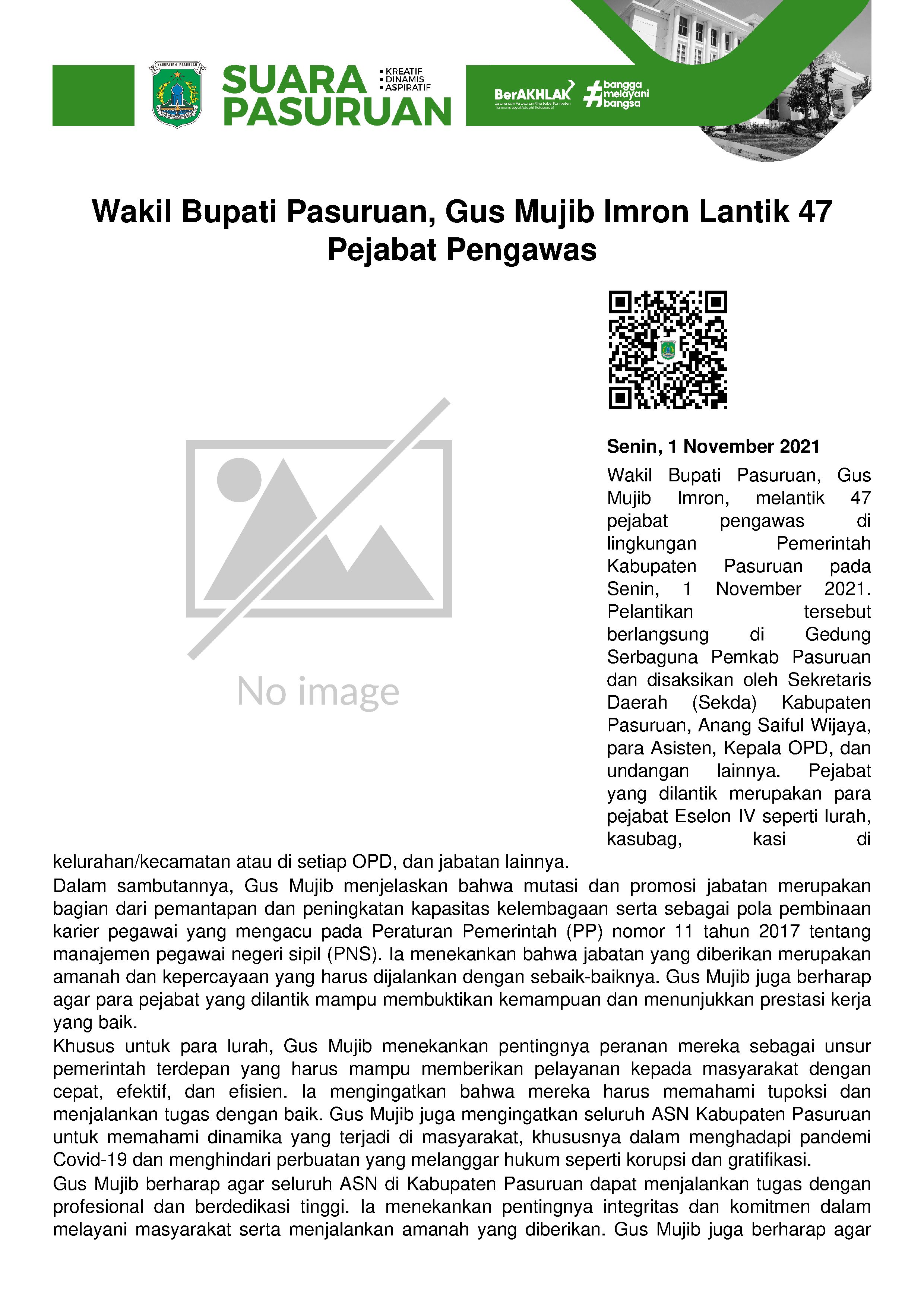 Puluhan pejabat tersebut dilantik dan diambil sumpahnya oleh Wakil Bupati Pasuruan, KH Abdul Mujib Imron (Gus Mujib), di Gedung Serbaguna Pemkab Pasuruan, Senin (01/11/2021) pagi.