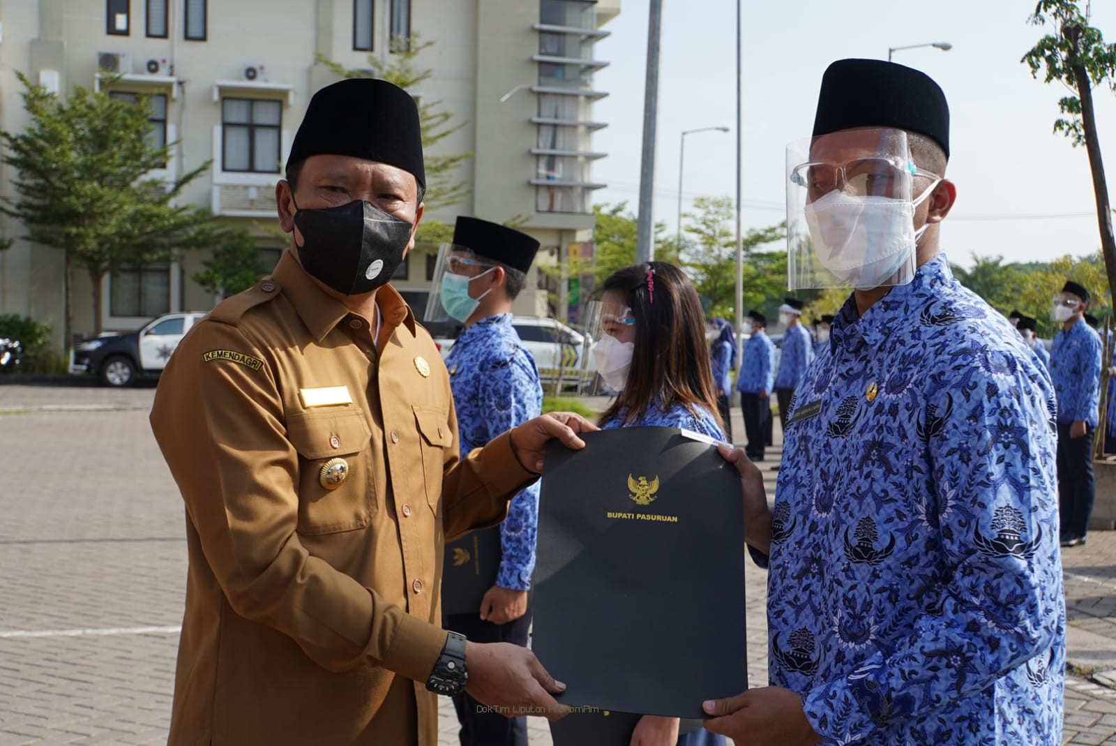 Tak hanya menerima SK saja, mereka juga langsung dilantik dan diambil sumpahnya oleh Bupati Pasuruan, HM Irsyad Yusuf di Halaman Kantor Dinas Pendidikan Kabupaten Pasuruan, Senin (07/03/2022) pagi.
