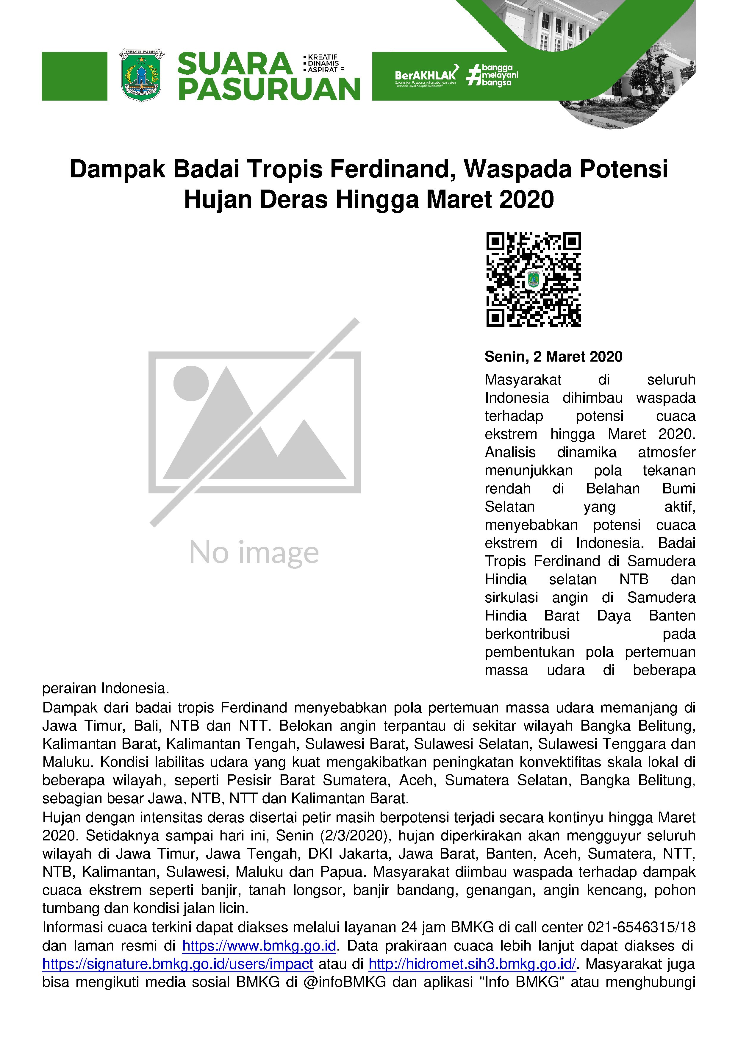 Berdasarkan hasil analisis dinamika atmosfer terkini, pola tekanan rendah di wilayah Belahan Bumi Selatan (BBS) masih cukup aktif berpengaruh pada pembentukan potensi cuaca ekstrem di wilayah Indonesia. Keberadaan badai tropis Ferdinand yang mulai terdeteksi pada tanggal 24 Februari yang lalu di Samudera Hindia selatan NTB serta sirkulasi angin di wilayah Samudera Hindia Barat Daya Banten. Sehingga menyebabkan pembentukan pola pertemuan massa udara di beberapa perairan di Indonesia.