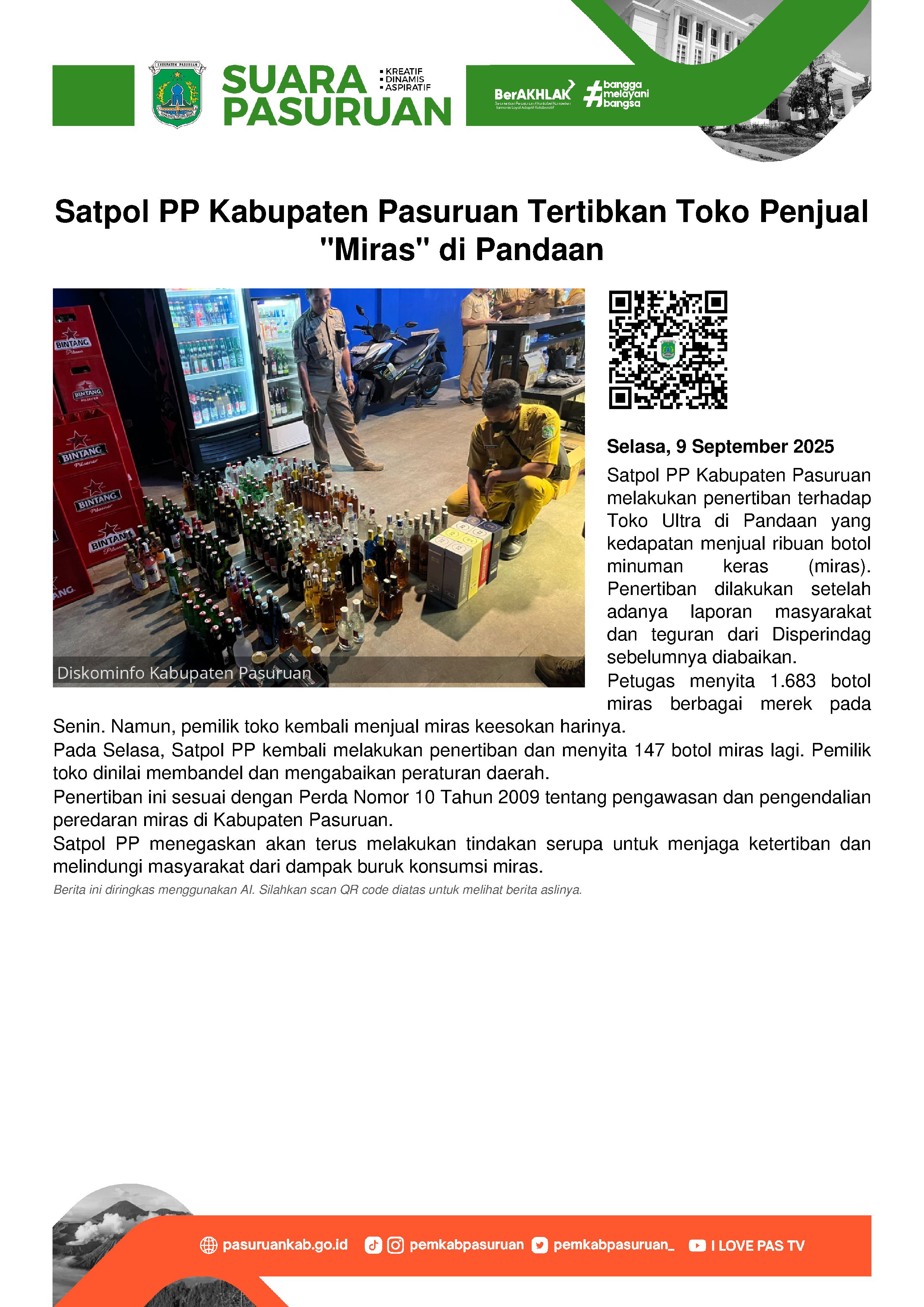 Satuan Polisi Pamong Praja (Satpol PP) Kabupaten Pasuruan menyita ribuan botol minuman keras (miras) yang masih dijual bebas ke masyarakat, Selasa (9/9/2025).