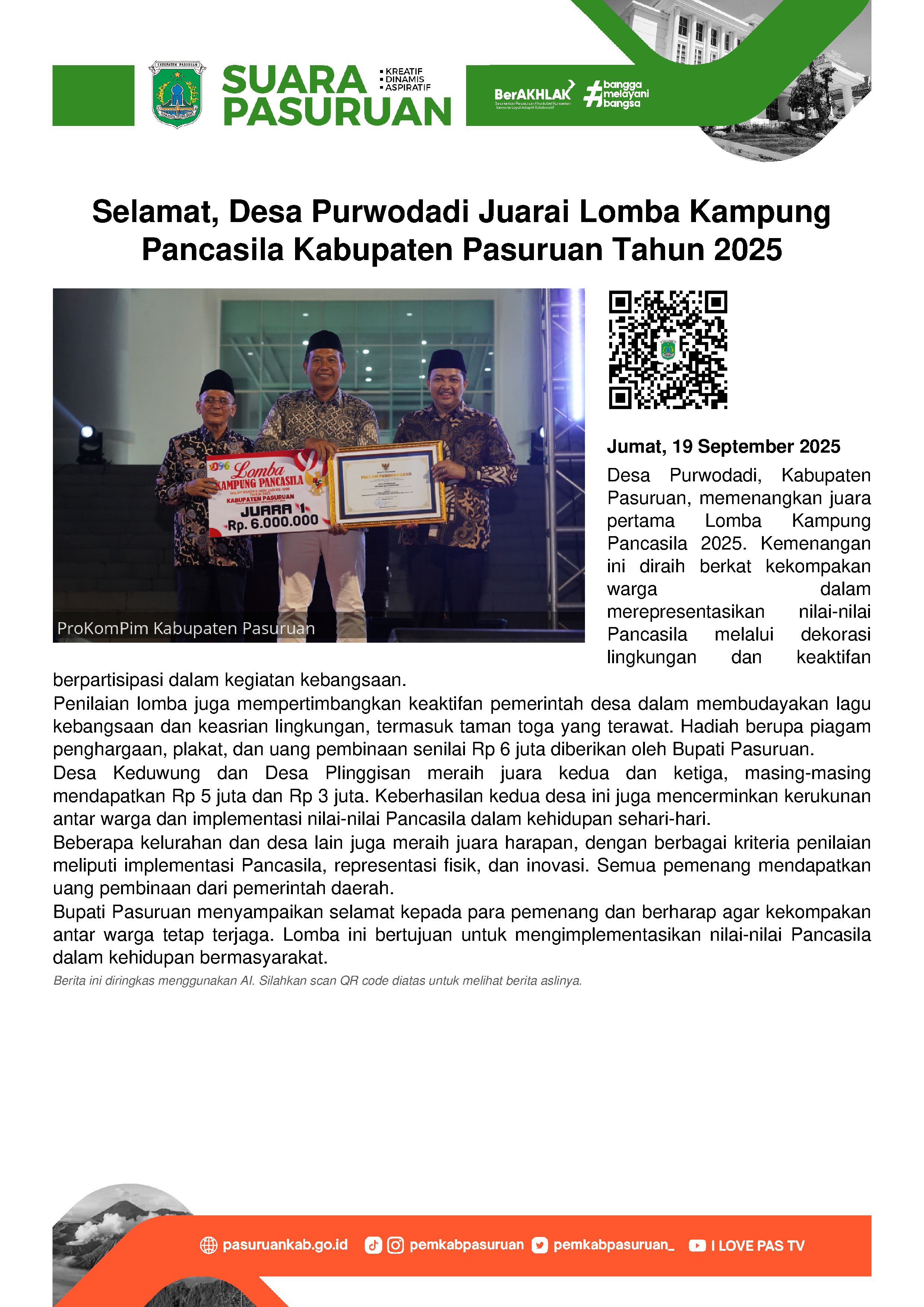 "Selamat dan sukses untuk semua pemenang Lomba Kampung Pancasila. Pertahankan kekompakan antar warga," pesan Mas Bupati Rusdi di sela menyerahkan Piagam Penghargaan kepada para pemenang lomba.